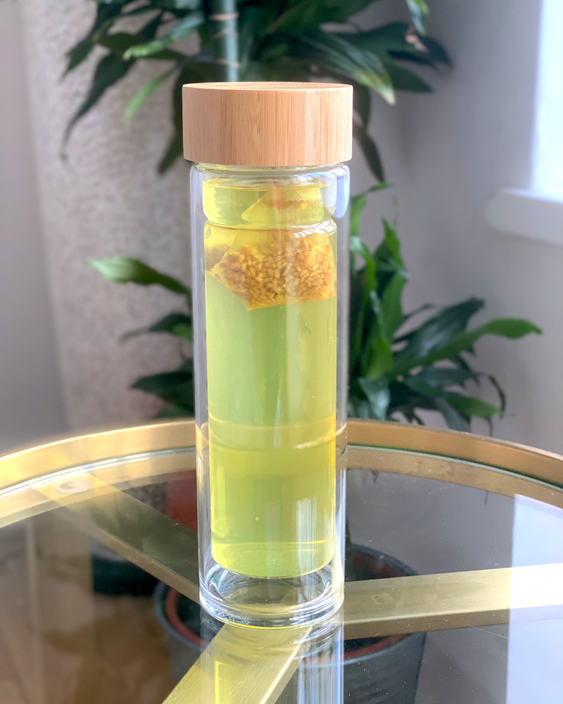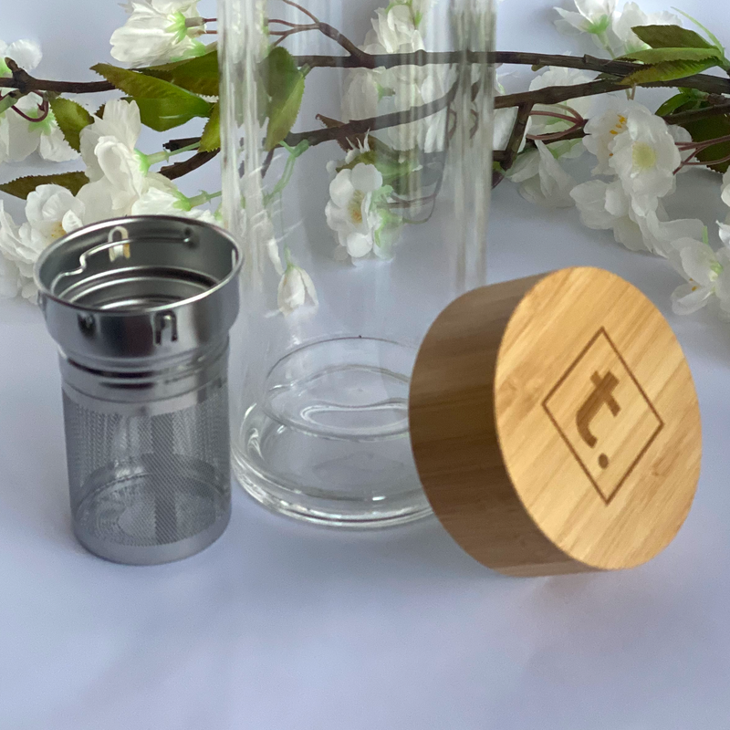 This durable glass bottle is ideal to use at home or in the car, without worrying about your tea going cold (it stays warm for hours!)
